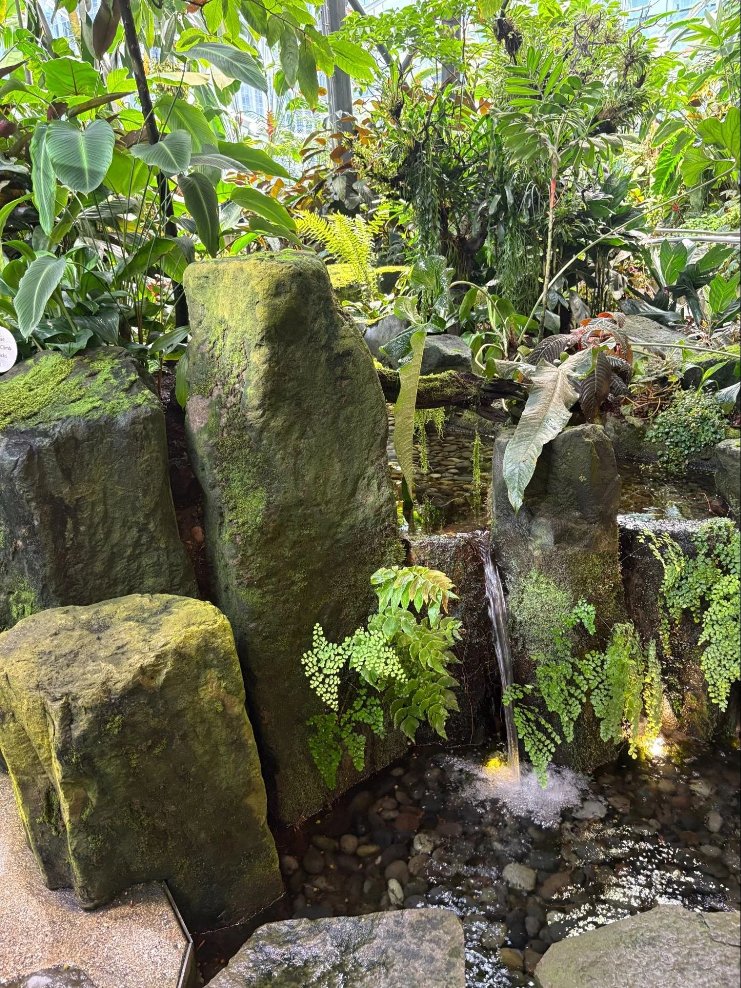 A babbling water feature surrounded by moss rocks at The Spheres. Photo: Jennifer Bousselot