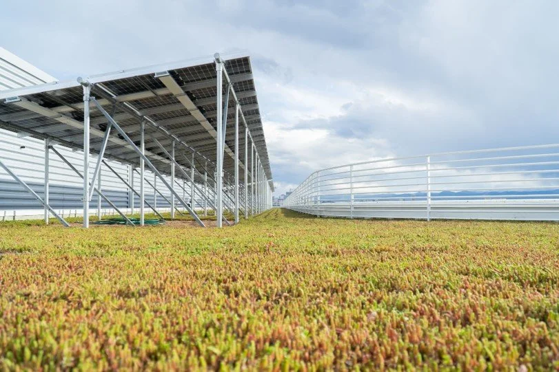 Rooftop agrivoltaics array on the Colorado State University (CSU) Spur campus rooftop on the Hydro building. Photo: Kevin Samuelson, CSU Spur.
