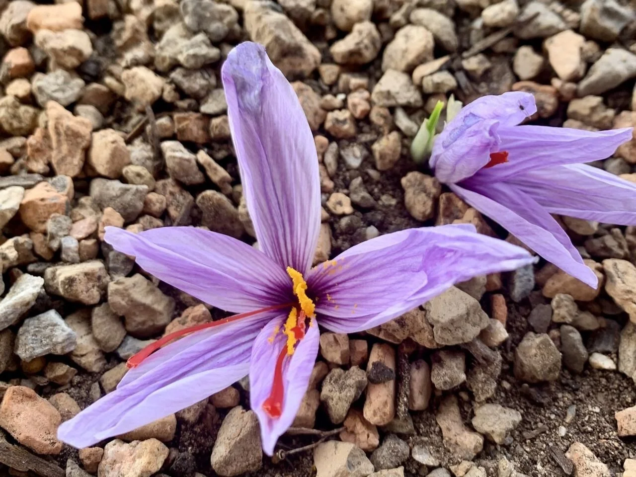 Saffron flower in bloom on November 26, 2024, under the rooftop agrivoltaics array at Colorado State University (CSU) Spur campus on the Hydro building rooftop. Photo: Jennifer Bousselot.