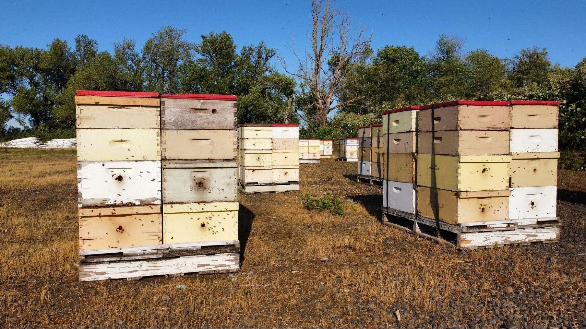 Honeybee hives from local farmers spread along the perimeter of Etera’s farm in Forest Grove, Oregon. Photo: © 2023 Samuel Hoefler