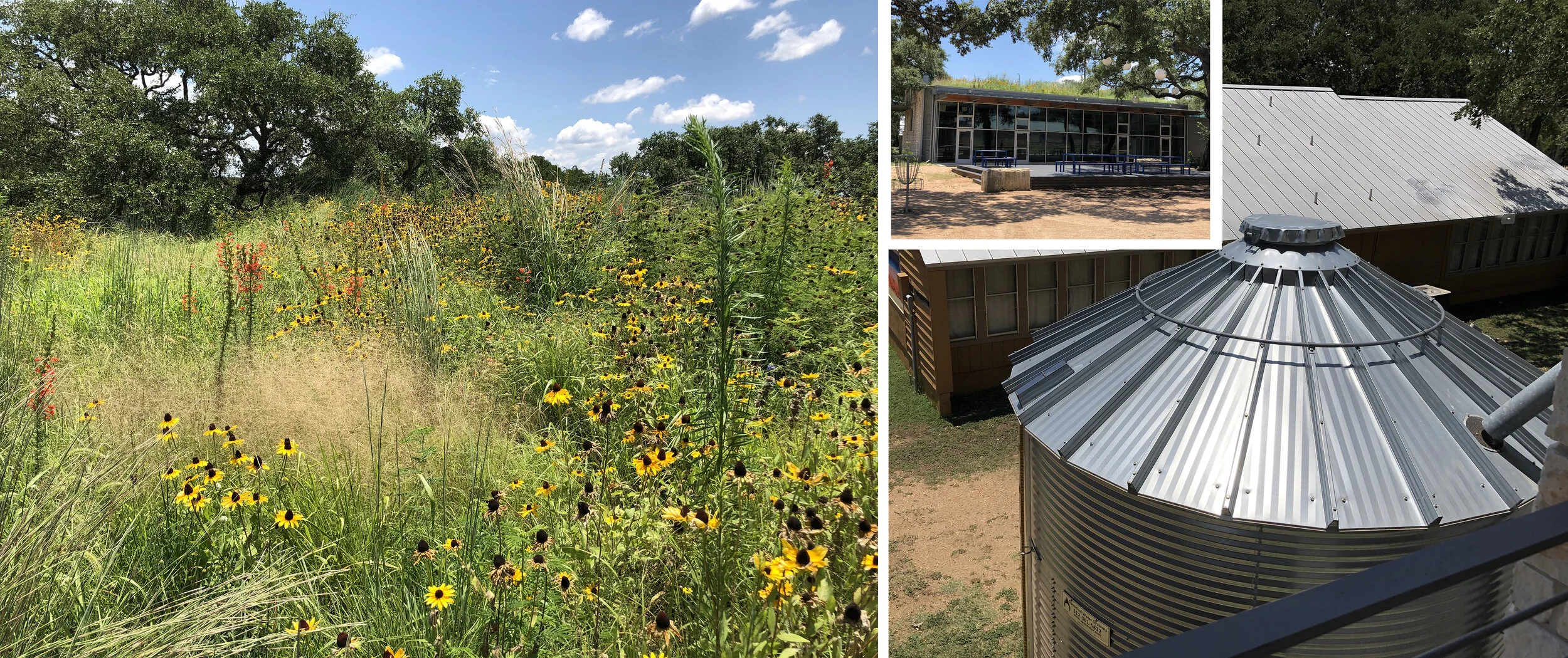 A variety of plants native to Blackland prairies (left) grow on a green roof outside of Austin, Texas (inset). Its 10-inch deep substrate is sloped and irrigated with harvested rainwater stored in an oversized cistern (right). Constructed in 2013, the well-established vegetation became dormant (no top growth) in 2018 when the irrigation pump stopped functioning and needed repairs. The images shown here were taken four months after the irrigation system was repaired. The perennial vegetation returned to its former glory, and seeds of many annuals that lied dormant on the substrate emerged. The yellow blooms of black-eyed Susan (Rudbecki hirta) are one of 15 annuals on this roof. Other annuals include Callirhoe leiocarpa, Chamaecrista fasciculata, Coreopsis tinctorial, Gaillardia pulchella, Lupinus subcarnosus, and Monarda citriodora, most of which grow across the central and eastern US and beyond. Photos courtesy Bruce Dvorak.