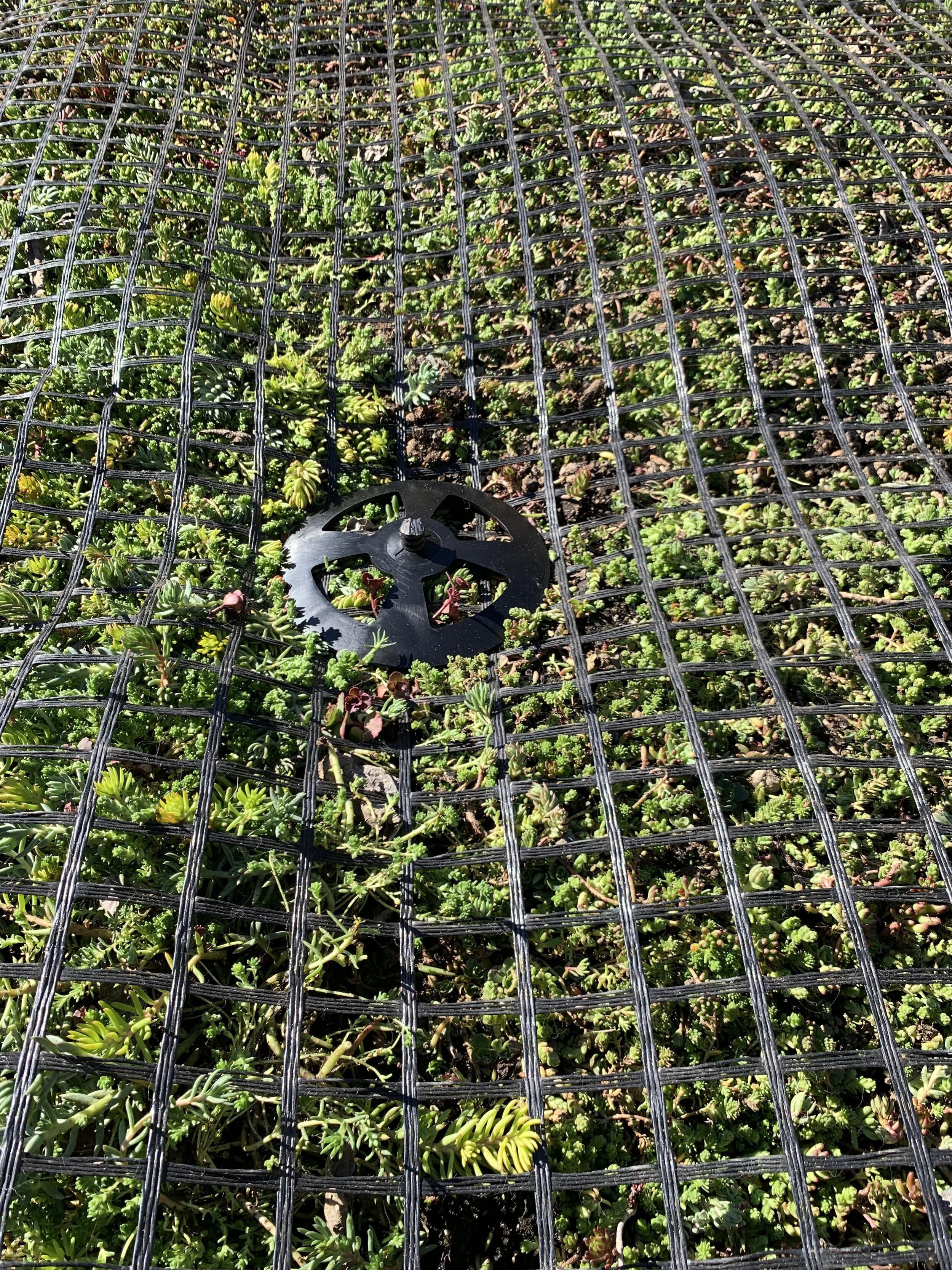 A slope stabilization system was used, consisting of steel cables and a geotextile mesh within the growing media, anchored down into the deck, and also bolted to the parapets. Two layers of mesh were placed within the soil, with curved cleats attached to the mesh, keeping the soil tightly confined, and holding it in place in spite of the slopes and winds.