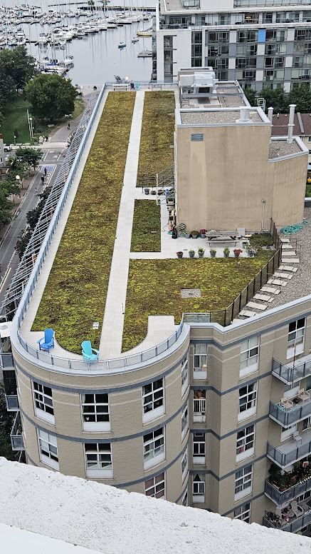 Then suddenly out of nowhere, upheaval! On November 3, 2025, with no consultation, no advance notice, no phase-out period and no compensation, the Ford government revoked the section of the City of Toronto Act which enabled it to enact the 15 year-old Toronto Green Roof Bylaw. This rash move has put 1,600 jobs in jeopardy, and decoupled the development process from the very urgent need to make the city more resilient and livable. In terms of jobs, a 2020 study conducted by the Delphi Group found that the Ontario green roof and wall industry had a gross output of more than $90 million and contributed more than $51 million to the GDP in 2018. (Delphi). The 1,200 green roof projects have resulted in more than 12.5 million square feet of green space which cleans the air, retains enormous amounts of stormwater, cools the city reducing the severity of heat stress, saves energy, supports pollinators and provides much needed amenity space. Several dozen projects have also been designed to grow food, recreationally and commercially, which improves food security.