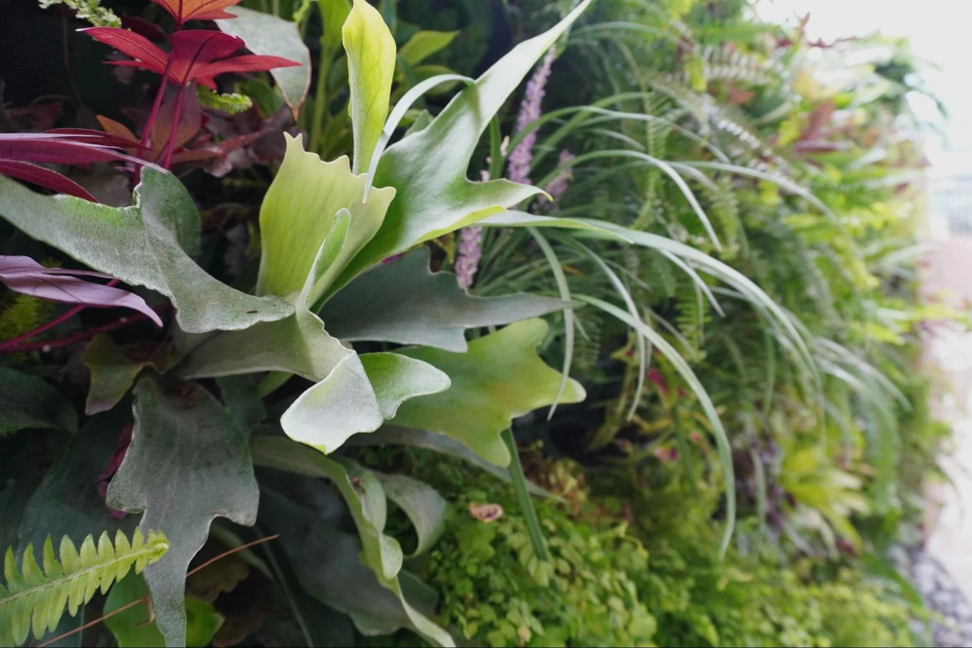 The plant palette blends native Texas species such as maidenhair fern, hardy adapted selections like lilyturf and creeping Jenny, and tropicals including staghorn fern and croton to provide texture and color throughout the year. This mix ensures resilience while keeping the wall vibrant and engaging.