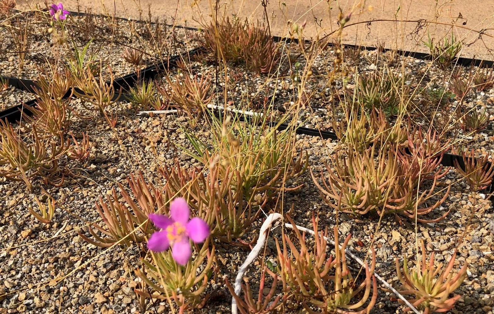Young fameflower plants grow here on a research green roof at Texas A&M University (planted 2022). In the wild, it grows and spreads in locations with shallow-well-drained soils such as talus slopes, glades, and barrens. This modular green roof tray has 4.5 inches (11.43 cm) of FLL-compliant growing media, modified for central Texas by a local producer. Shown here on a 104-degree day (40° C) in August 2023 preceded by nearly two months of 100-degree temperature days and scant precipitation these fameflowers still thrive. Photo: Bruce Dvorak