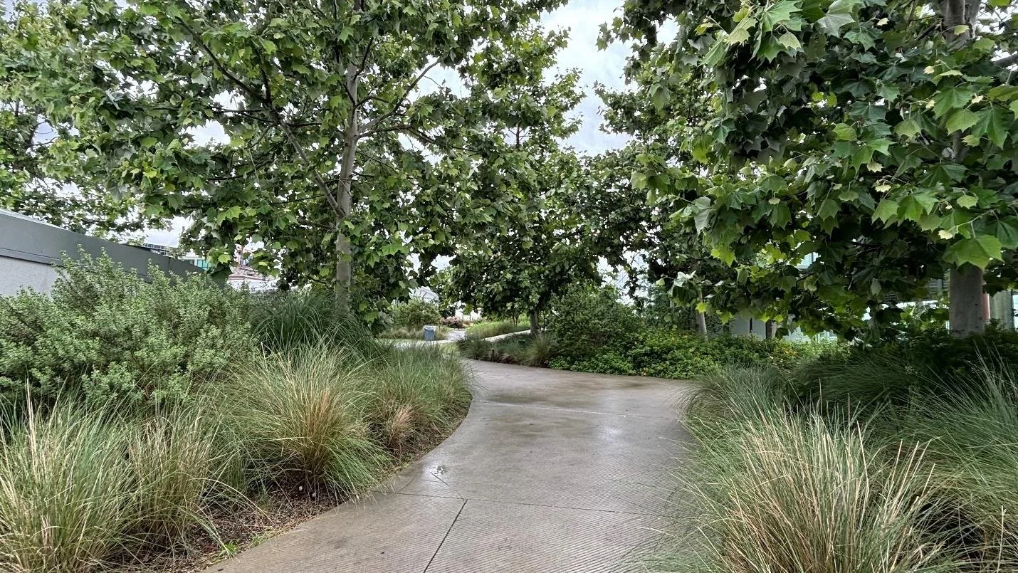 A Tree Alley of Mexican sycamore trees on the POST Houston rooftop park. At five acres, it is the second-largest roof garden in Texas and one of the largest public rooftop parks in North America. Photo: Bruce Dvorak