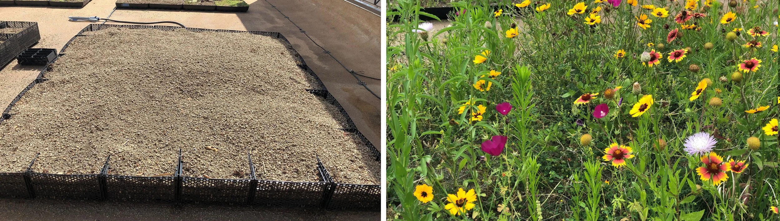 (left) Image shows rooflite® extensive growing media that was originally installed on green roof experimental plots at Texas A&M University in 2012 in Tecta America® trays. Shown here in 2022, the media was repurposed in Bioroof® modular trays mounding from 8” at the edges to 12” in the center and was seeded with a native Blackland prairie mix. (right) Sunlight, precipitation, and supplemental watering brought the seed and substrate to life after one growing season (Dvorak and Woodfin 2023). Photo: Bruce Dvorak