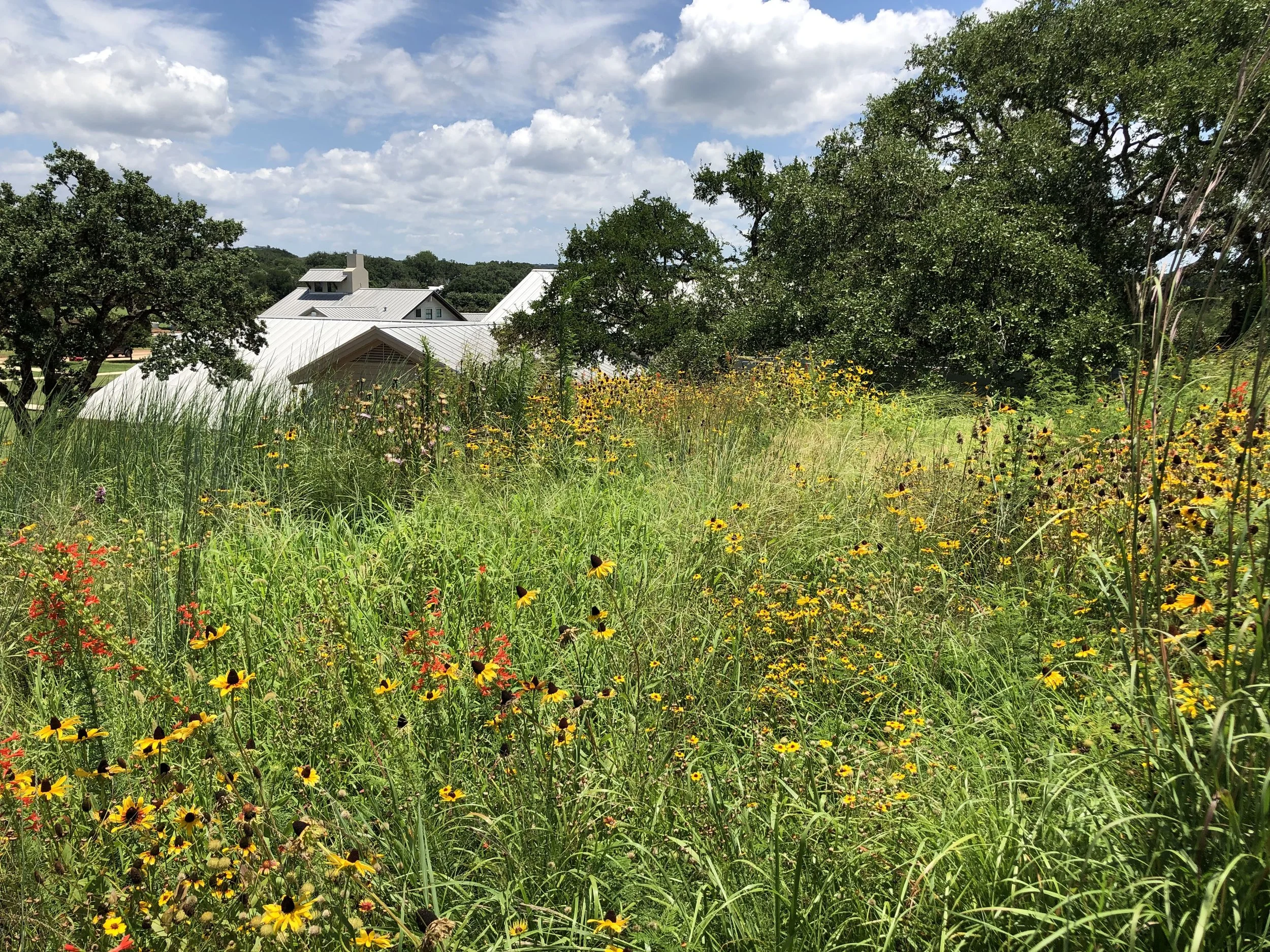 While prairie vegetation may grow in 5 or 6 inches of substrate east of the Mississippi River, its application in Texas typically requires deeper substrates in locations that frequently experience prolonged drought and greater heat stress. Here a 10-inch-deep substrate (25 cm) supports Blackland prairie vegetation above a kitchen house outside of Austin, Texas. This green roof’s substrate is a proprietary custom blend developed by Blackland Collaborative staff, based on years of research and development. Photo Bruce Dvorak