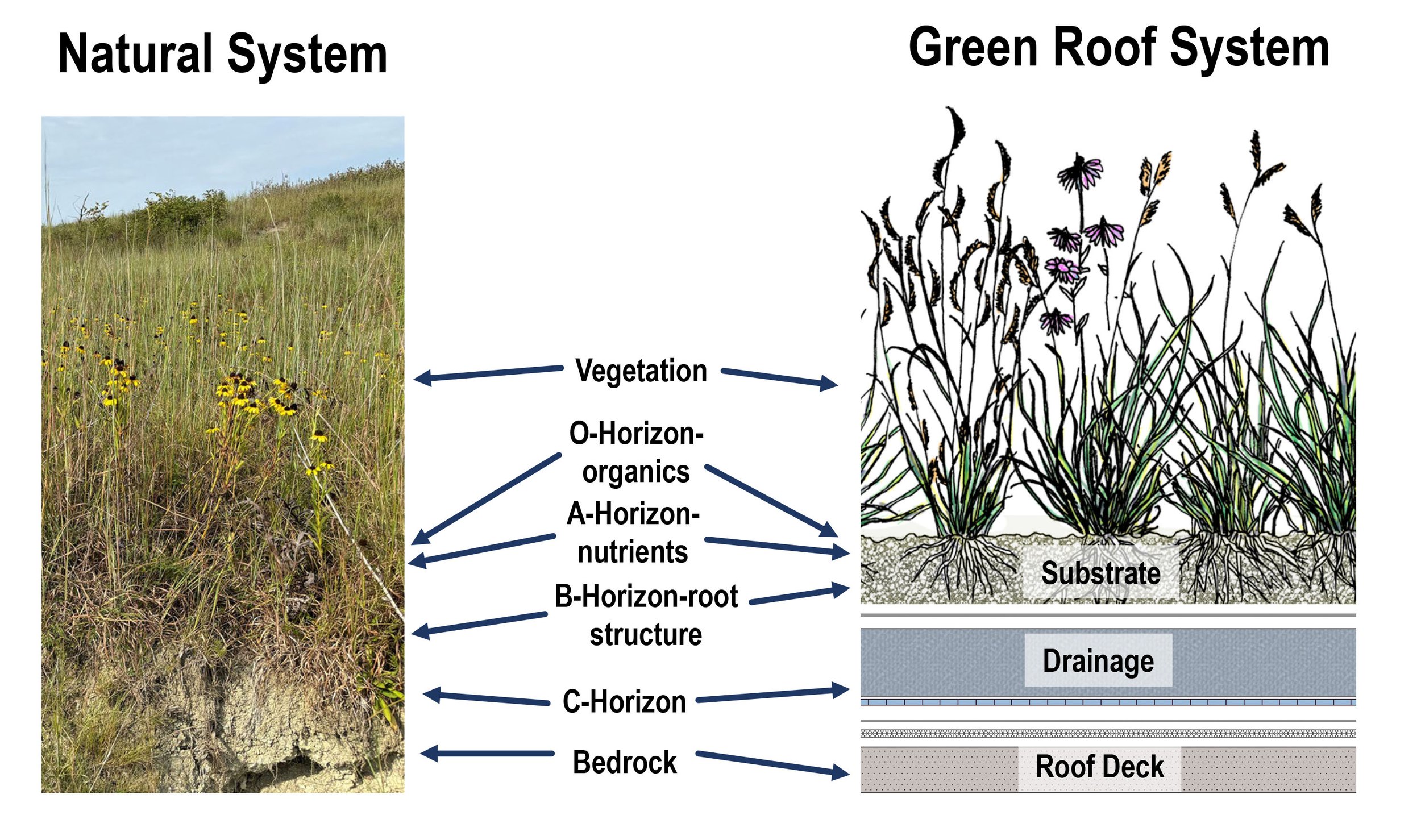 Diagram of key functional roles of natural and fabricated systems provided with green roof systems. Bruce Dvorak