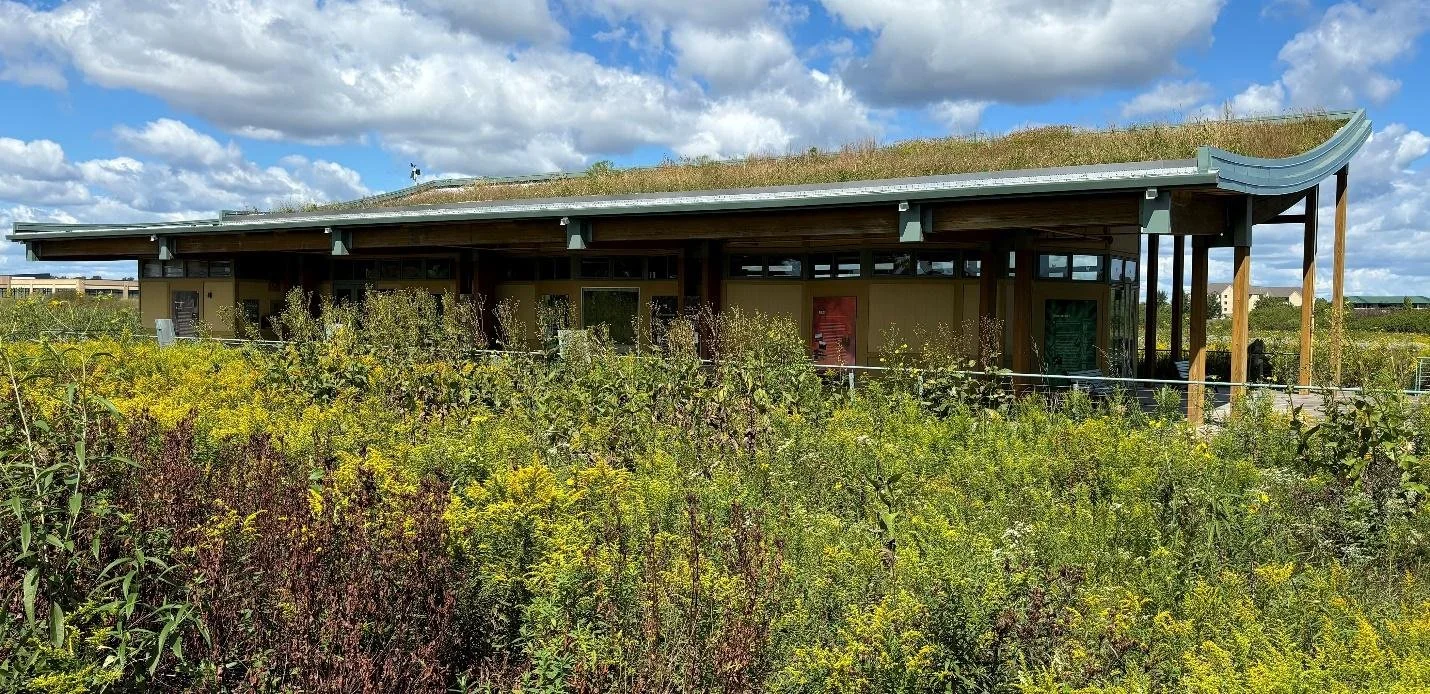 Evelyn P. Tyner Interpretive Center in Glenview, Illinois, preserves tallgrass prairie habitat and a green roof. The green roof is planted with native and adaptive plants, which helped achieve LEED Platinum certification. Plants include a sedum base with native taxa interspersed, including allium, coreopsis, heuchera, and eastern prickly pear installed into the six inches of substrate. This project exemplifies how a sedum base can be expanded by including some natives. Photo: Bruce Dvorak