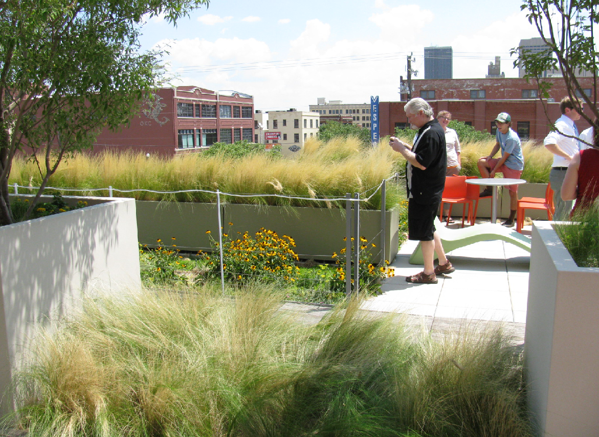 A visit to a roof garden is part of a green roof symposium in Oklahoma City in 2012. The guided tour introduces diverse stakeholders to the multiple values of diverse plants growing on rooftops. Photo: Bruce Dvorak